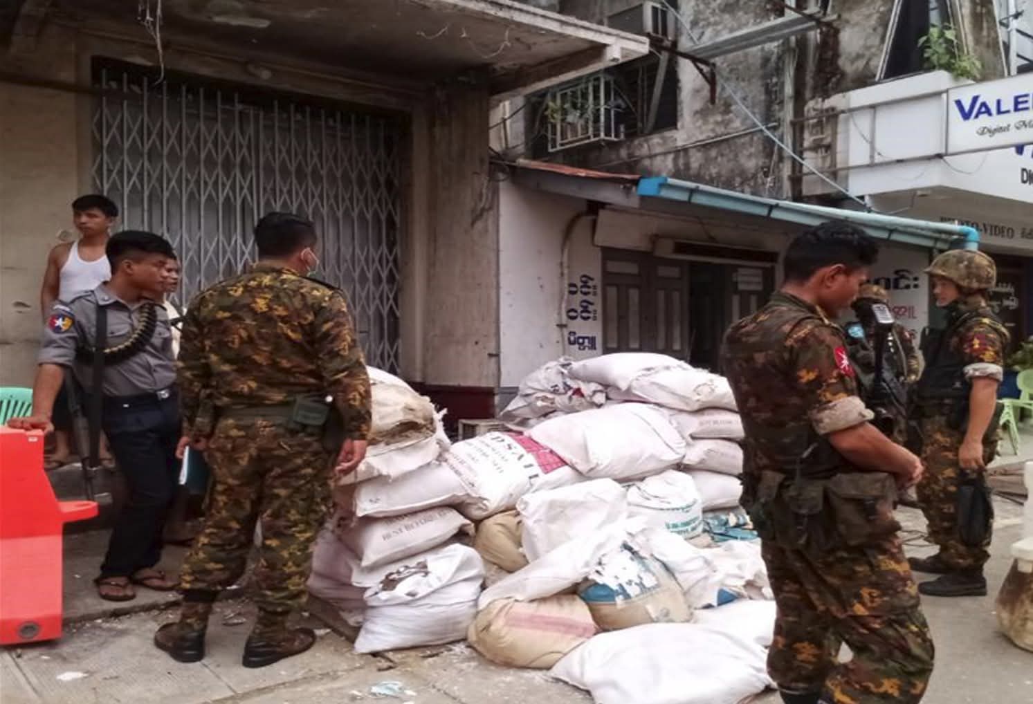 ဓာတ်ပုံ- စစ်တပ်နှင့်ရဲများက ရန်ကုန်တိုင်းအတွင်းရှိ ရပ်ကွက်အုပ်ချုပ်ရေးမှူးရုံးတစ်ခုကို လုံခြုံရေးယူထားစဉ်။ (ပုံအဟောင်းဖြစ်ပါသည်။)